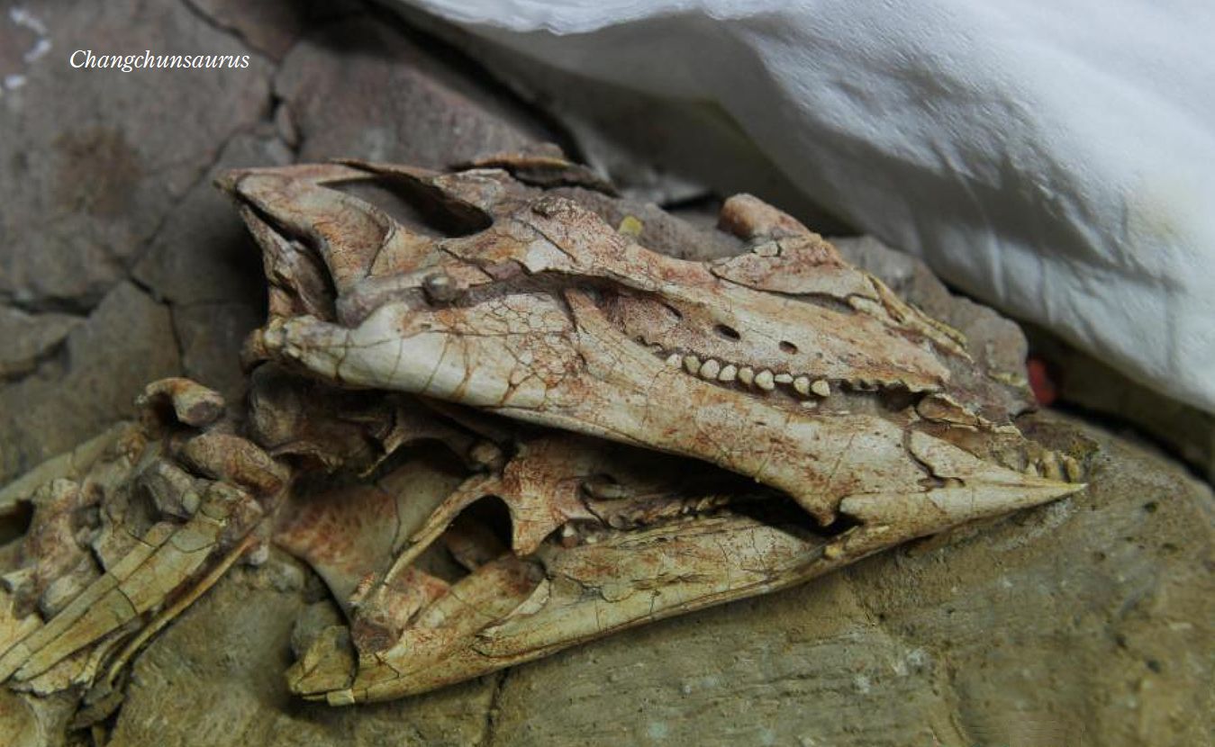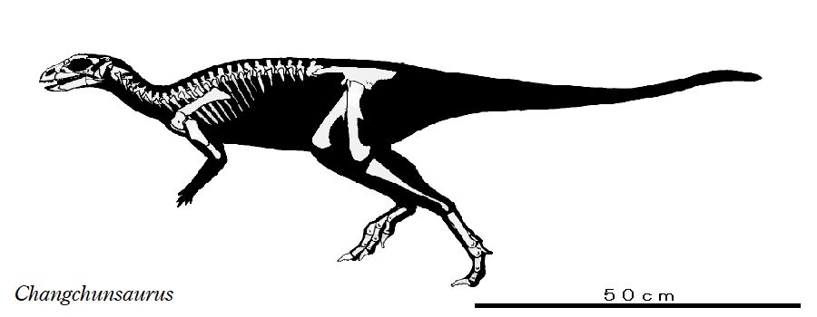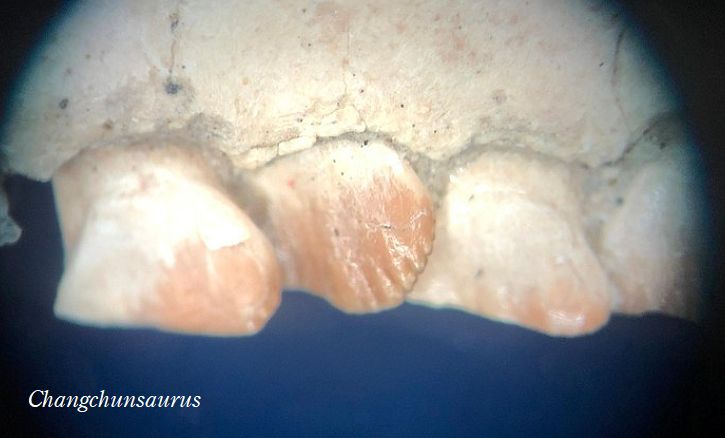 | チャンチュンサウルスの化石は、中国吉林省公珠陵、松遼盆地の白亜紀前 期(約1億2000万年前)のクアントウ累層から発見された。チャンチュン サウルスは、長春から産出したので長春竜「長春トカゲ」と名付けられた。 化石は、頭蓋骨と体骨格、部分的な下顎であった。前上顎骨片側には、短 いくちばし部分と5本の歯の部分があり、前上顎骨の歯と頬歯の間には、 小さな隙間がある。頬歯歯冠は、切縁に歯状突起(鋸歯状突起)のある葉状 である。頬歯は、各々片側に20個前後ある。上の二段目の画像は、右下顎 の近心側頬歯である。特徴としては、頬骨の側面から突き出た突起があり、 「ナブル構造」と呼ばれるものがある。チャンチュンサウルスの頭蓋骨の長 さは、11.5cmであり、全長は、約1mであったと推定されている。二足歩 行の小さな草食恐竜であった。 |