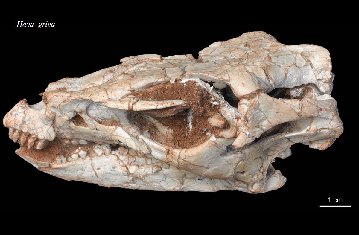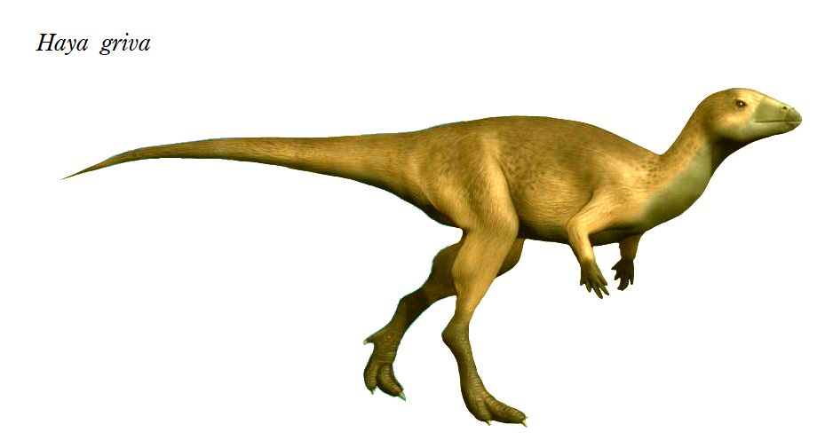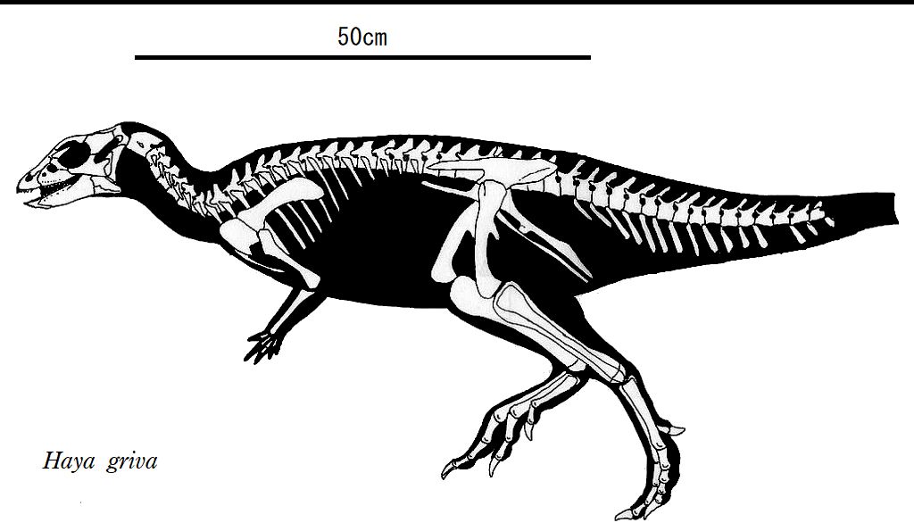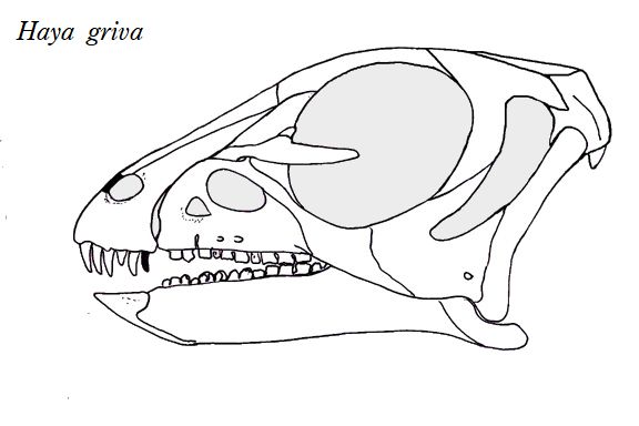 | ハヤの化石は、モンゴル、フーゲネツラフカント地域の白亜紀後期(約8600 万年前)のジャヴクラント累層から発見された。化石は、完全で保存状態の 良い頭蓋骨と骨格であった。大量の胃石も保持していた。学名は、ヒンド ゥー教のヴィシュヌ神の守護神のサンスクリット語での名前で、長い馬面 が似ているため名付けられた。前上顎骨の片側に5~6本の細長い犬歯状 の前歯があり、頬歯は、ノミ状で、上顎の片側に10本程度、下顎の片側 に14本程度ある。全長は、約1.4mであったと推定されている。 |