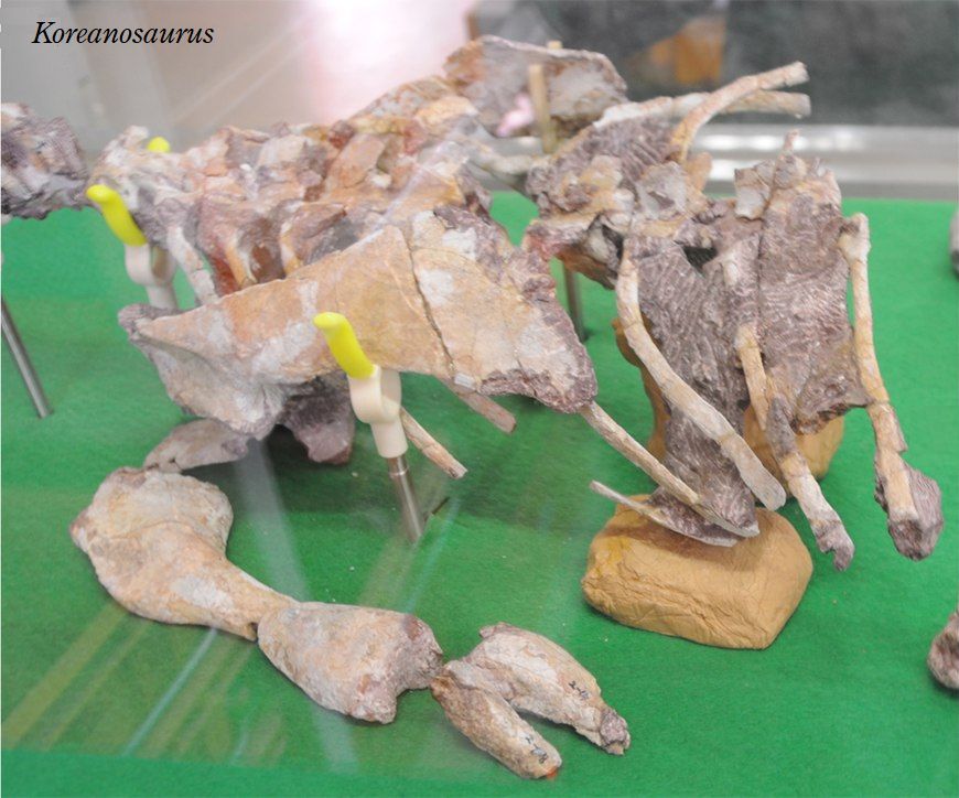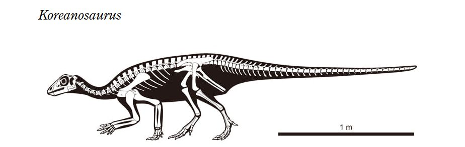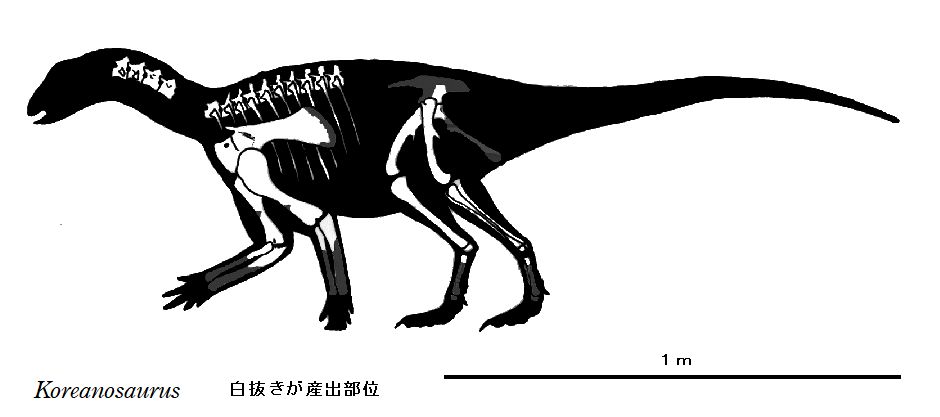 | コリアノサウルスの化石は、2003年に韓国、全羅南道ボソン郡、ビボンリ の白亜紀後期(約9960万年前)のソンソ礫岩層から発見された。化石は、 頭蓋骨を欠いた前部骨格、後肢の一部を含む骨盤帯であった。後肢は、比 較的短く、前肢は、長目であった。コリアノサウルスは、産出地の小さな 巣穴の存在に基づいて、おそらく前肢で穴を掘る恐竜だったと想像されて いる。全長は、約2~2.4mであったと推定されている。四足歩行の比較的 小さな草食恐竜であったと考えられている。 |