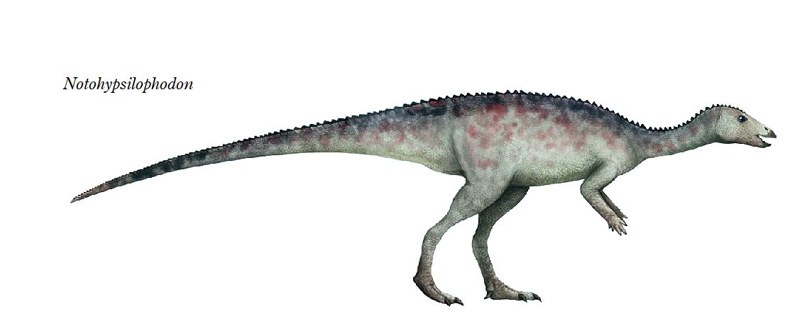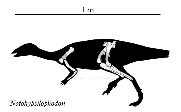| ノトヒプシロフォドンの化石は、アルゼンチン、パタゴニア、チュブ北部 にあるサンホルヘ盆地の白亜紀後期(約9000万年前)のバホバレアル累層 から発見された。化石は、頭蓋骨を欠き、4つの頸椎、7つの胸椎、5つ の腰椎、6つの尾椎、4つの肋骨片、部分的な左肩甲骨、部分的な右烏口 骨、右上腕骨、尺骨の両方、および左脚の大部分(足指を除く)、右腓骨と 距骨を含む部分的な骨格、および13個の指骨であった。神経弓は、椎骨 に融合していないため、完全に成長していない個体と見なした。全長は、 約1.3m、体重6Kgであったと推定されている。 |