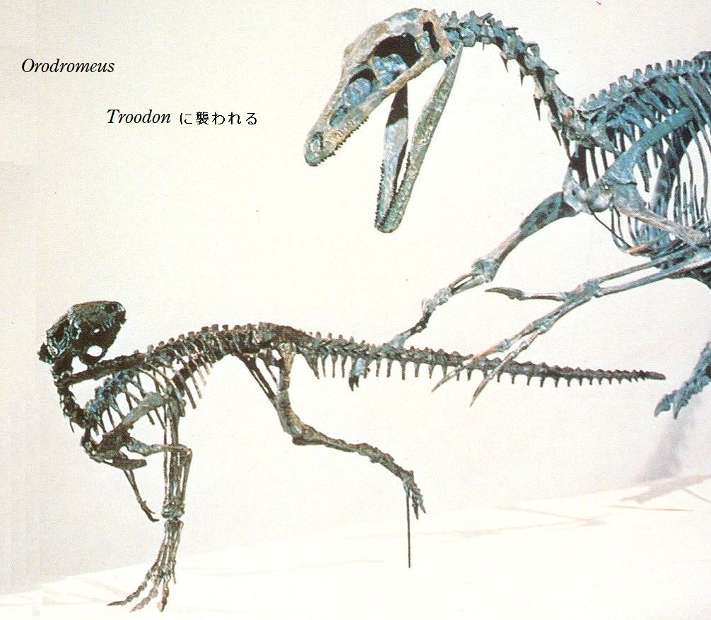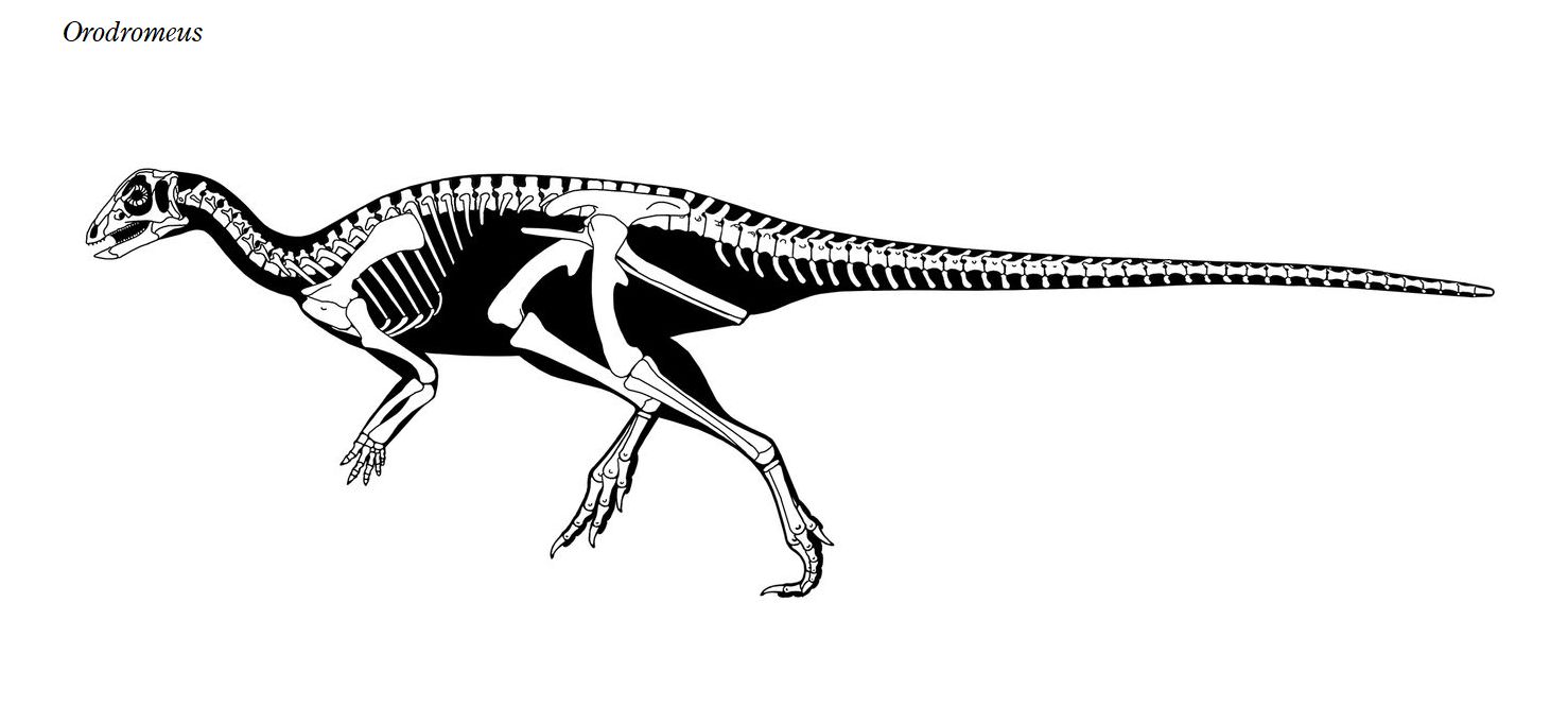 | オロドロメウスの化石は、アメリカ、モンタナ州ティトン郡で白亜紀後期 (約7500万年前)のツーメディスン累層から発見された。オロドロメウス は、産地のマイアサウラのエッグマウンテンサイトからギリシャ語のオロ ス「山」と、ドロメウス「ランナー」をもとに名付けられた。化石は、頭蓋 骨を持つ部分的な骨格から成る。一緒に、胚をいくつか含む、19個の卵 の殻も産出した。上顎歯と下顎歯の歯冠は、三角形で垂直咬合をしていた。 オロドロメウスは、オリクトドロメウスによく似た巣穴を掘った可能性 があると推測されている。全長は、約2.5mであったと推定されている。小 型の高速で走る、二足歩行の草食恐竜だった。 |