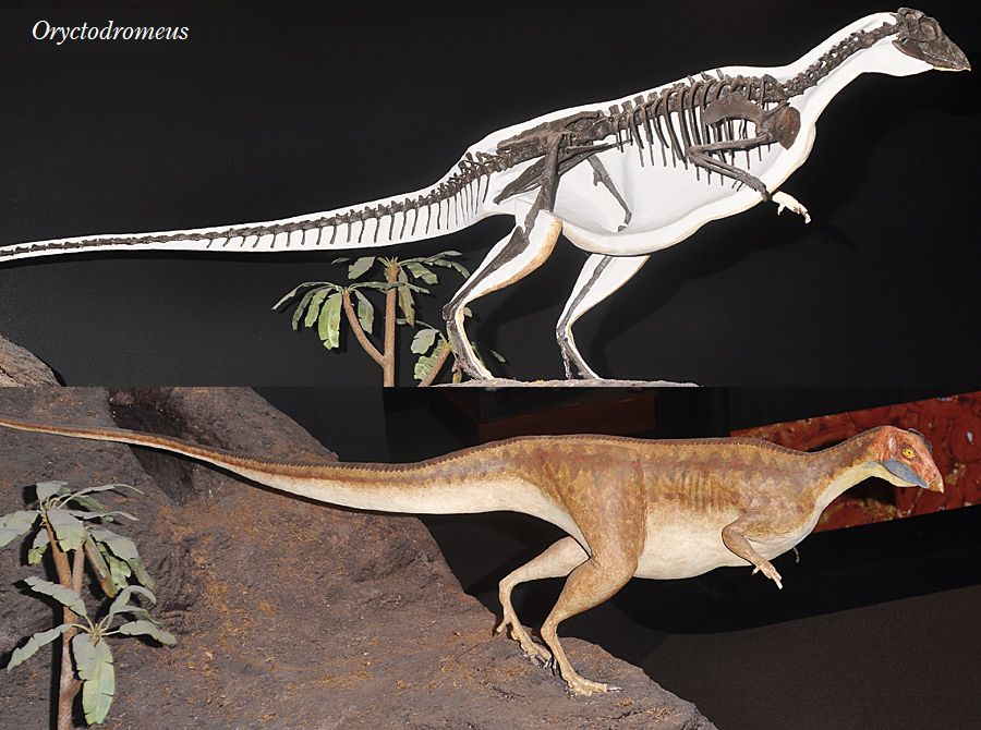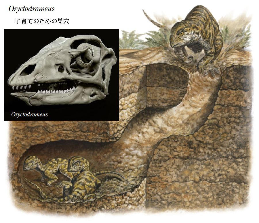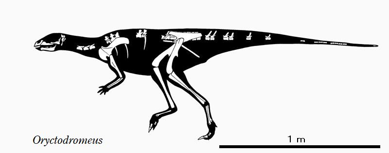 | オリクトドロメウスの名前は、「穴を掘るランナー」の意味で付けられた。 化石は、アメリカ、モンタナ州南西部の白亜紀中期(約9500万年前)のブラ ックリーフ層、および、アイダホ州南東部の白亜紀中期(約9500万年前)の ワイアン層から発見された。化石は、成体の部分骨格であり、前上顎骨(上 のくちばし)、部分的な脳函、3つの頸椎、6つの胴椎、7つの仙椎、およ び、23個の尾椎、肋骨、肩帯、手、両側の脛骨、不完全な腓骨、1つの中 足骨が含まれている。ワイアン層の標本から胴椎、仙椎、尾椎に分厚い腱 の網目が存在していることがわかった。化石は、巣穴に埋まった状態で発 見されている。この穴は、長さ2m、幅70cmほどであった。これらの骨 格は、密集して押し込まれ、関節しておらず、巣穴の中で死んで腐敗した ことが示唆される。これらの巣穴は、内部が砂で満たされており、巣の周 囲が泥岩や粘土岩なのに砂岩となっている。初めて前肢で穴を掘る習性の 証拠が示された恐竜である。体長1.3mの幼体と成体が同じ巣から発見さ れており、子育てのための巣穴だったと考えられている。全長は、約2.1m、 体重は、22~33kgほどであったと推定されている。二足歩行で、小型で おそらく速く走る草食恐竜だった。 |