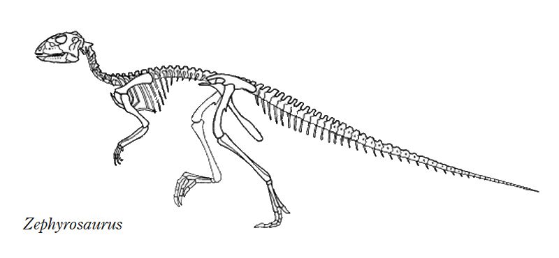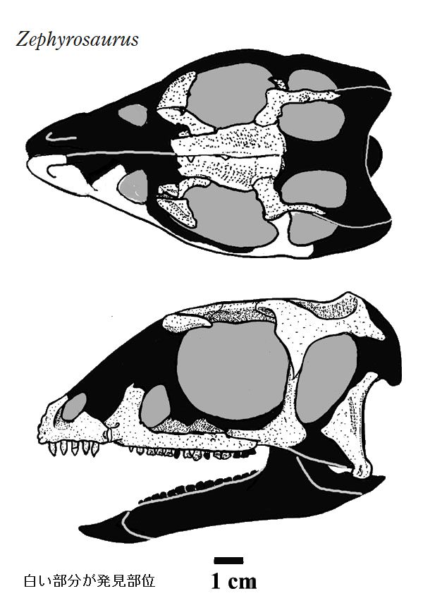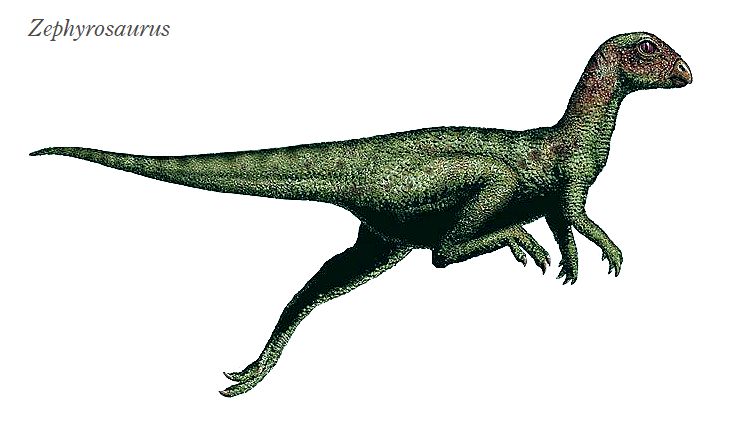 | ゼフィロサウルスの化石は、アメリカ、モンタナ州、カーボン郡の白亜紀 前期(約1億1300万年前)のクローバリー層から発見された。ホロタイプ の化石は、断片的な顎、脳函およびそれに関係する頭部の骨、いくつかの 部分的な椎骨、肋骨の断片である。標本が不十分すぎるため、あまりよく 分かっていない恐竜だった。独自の特徴は、急傾斜の顔、上顎骨にある盛 り上がったこぶ、頬骨の大きなこぶがある。くちばしには、歯があった。 その後、新たな標本は、体の全ての領域からのものが含まれる、少なくと も7個体分の化石であった。全長は、約1.8mであったと推定されている。 ゼフィロサウルスは、巣穴を掘っていた可能性がある、小型で俊敏な、二足 歩行の草食恐竜だった。 |